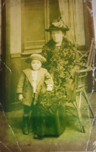 The woman in this photo is my maternal great grandmother, Mary Paddock, née Hall. She was remembered fondly by my mother, who told me that the boy in the photo was Mary’s youngest surviving son, Alan, who was born in 1912. From this information, I estimate that the photo was taken around 1914/1915. The second photo pictures an older Mary and probably dates from the late 1920s.