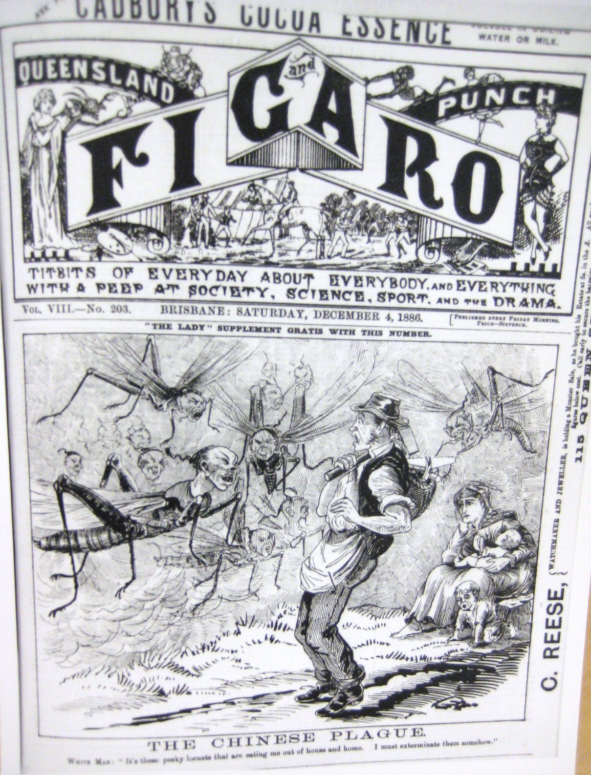 Within a few short years, the gold played out. Sam was amongst many Chinese intent on remaining in Australia, while the wider Australian community regarded with suspicion the numbers of Chinese infiltrating into towns and cities from Palmer River. During the decade 1871-81, Chinese immigration peaked and the level of racist sentiment kept pace; a popular Queensland weekly published a cartoon depicting Chinese as insects; the caption reads “White Man: It’s these pesky locusts that are eating me out of house and home. I must exterminate them somehow”, suggesting a level of bigotry bordering on panic. (The Chinese Plague’, Queensland Punch & Figaro, 4 December 1886)